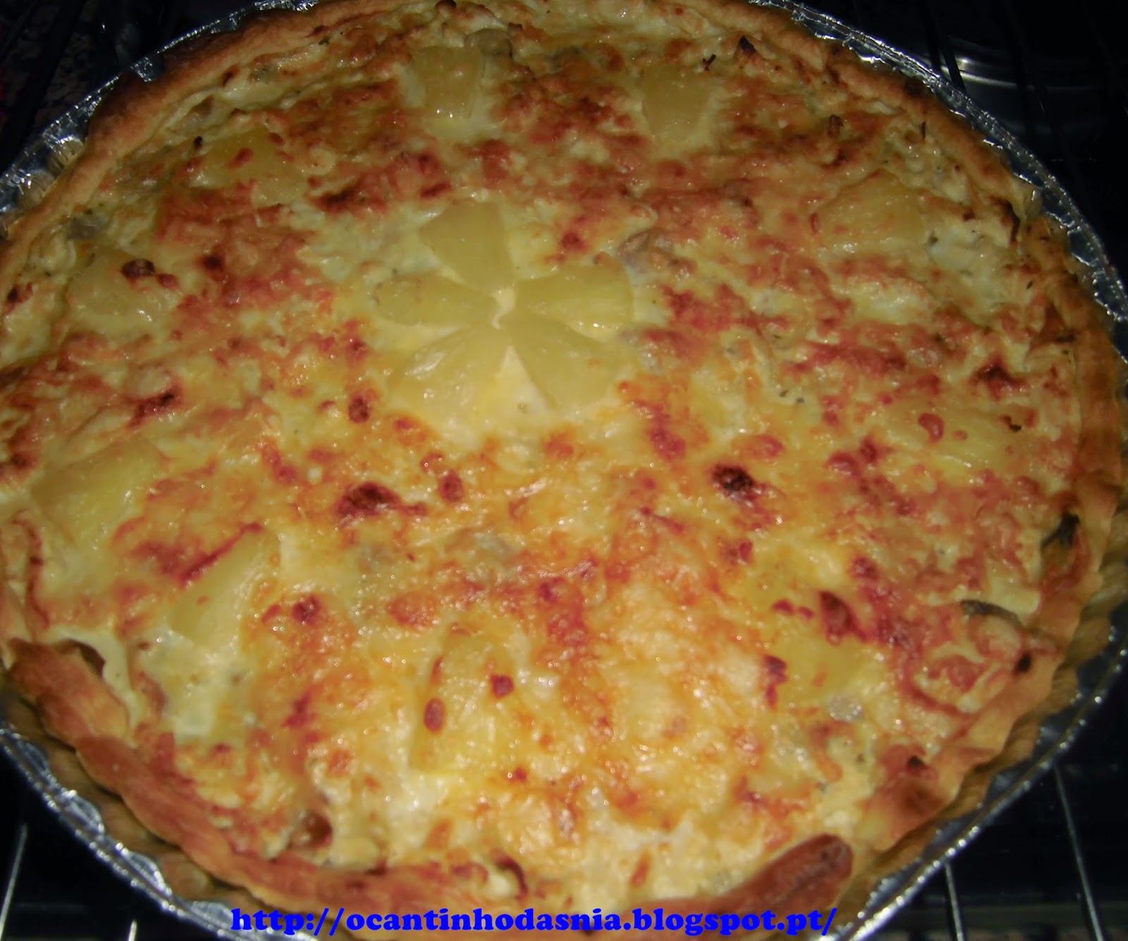 Numa tigela Bata as claras, e adicione os Iogurtes, tempere com Sal e pimenta, misture tudo muito bem e adicione ao preparado anterior. Polvilhe com Queijo e decore a Tarte com pedaços de Ananás.